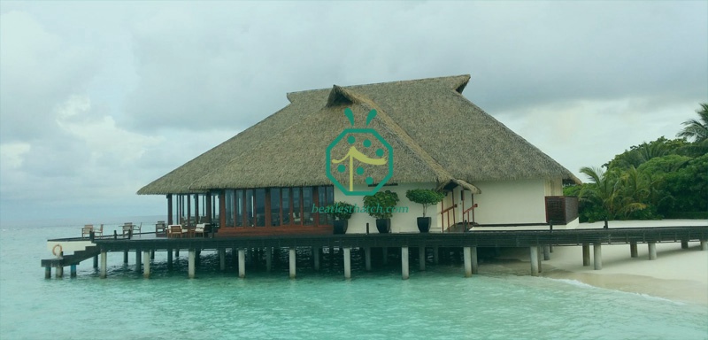 Il tetto in paglia di plastica LLDPE per la villa presidenziale sull'acqua ha un'elevata resistenza alla corrosione ed è molto facile da installare e manutenere. È la scelta migliore per l'arredamento di resort per le vacanze.